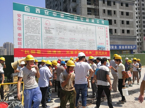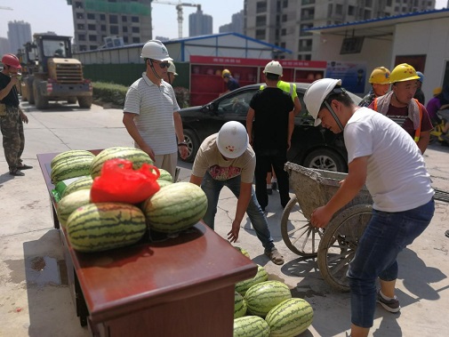 同時為進一步推進保障房項目文明施工管理,7月26日上午,公司黨委、工會、安委會再次對丈八路保障房項目開展“送清涼·享關愛”防暑降溫慰問活動。將西瓜、綠豆、白糖等防暑降溫用品送達施工一線的工人手中,并叮囑大家一定要嚴格執行高溫措施,注意勞逸結合和防暑降溫,切勿麻痹大意造成傷害。長期身處一線職工對公司黨委、工會和安委會的關愛行動表示感謝。